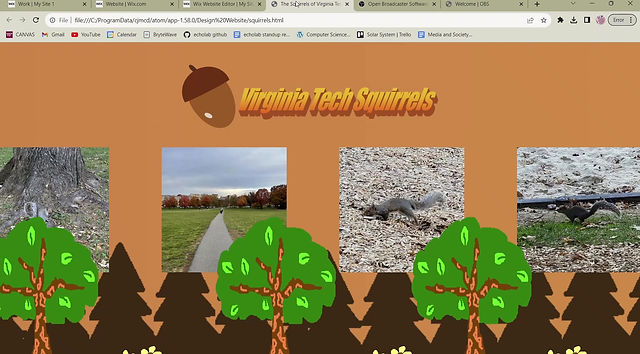 With CSS, JavaScript, and HTML, I implemented an archive of all the squirrels pictures and captions I possessed, as well as a horizontal scrolling gradient across the site to imitate the changing seasons of Virginia Tech . I then used Word Art and Microsoft Paint to create the other necessary assets for the website such as trees flowers, and the site header. I then implemented a hovering mechanism over the squirrel photos in order to preserve their captions without interrupting the simplistic and nostalgic aspect of the website. I also added in some photos of the beautiful campus itself in order to convey what a wonderful place Virginia Tech is down to its buildings and squirrels.